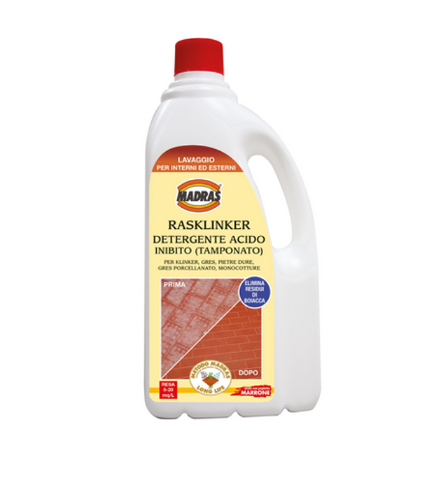RASKLINKER è il detergente acido per asportare, da pavimenti nuovi, residui di boiacche e cemento, affioramenti salini e depositi calcarei in genere.